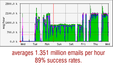 ROBOMAIL XTREME ON ONE SERVER STATS 1.3 million emails per hour and percentages.